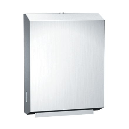 Acest dispenser este realizat din oțel inoxidabil de 22 gauge, cu un finisaj satinat elegant, și poate distribui până la 400 de prosoape pliate tip C sau 525 de prosoape tip multifold, fără a fi nevoie de adaptări sau reglaje suplimentare. Este prevăzut cu o încuietoare de siguranță tip tambur și o balama rezistentă, tip pian, din oțel inoxidabil, pentru durabilitate și fiabilitate în utilizare zilnică.